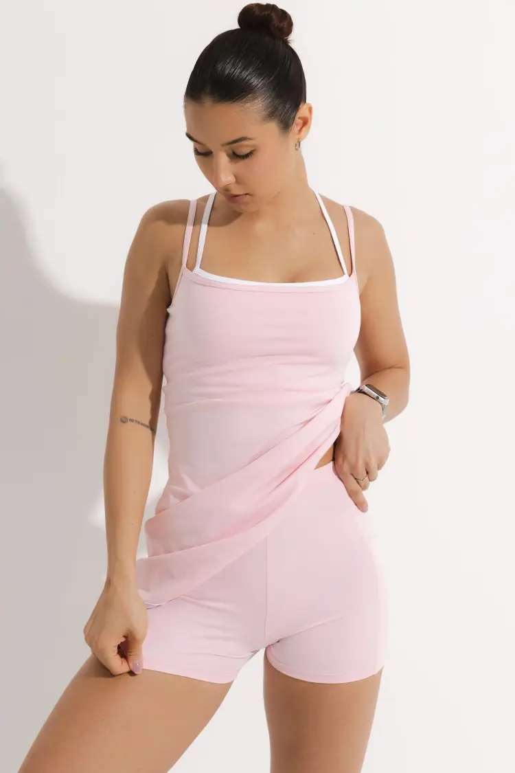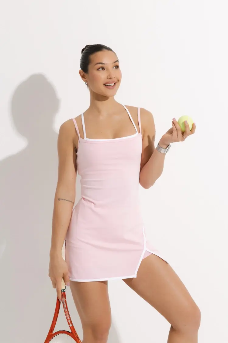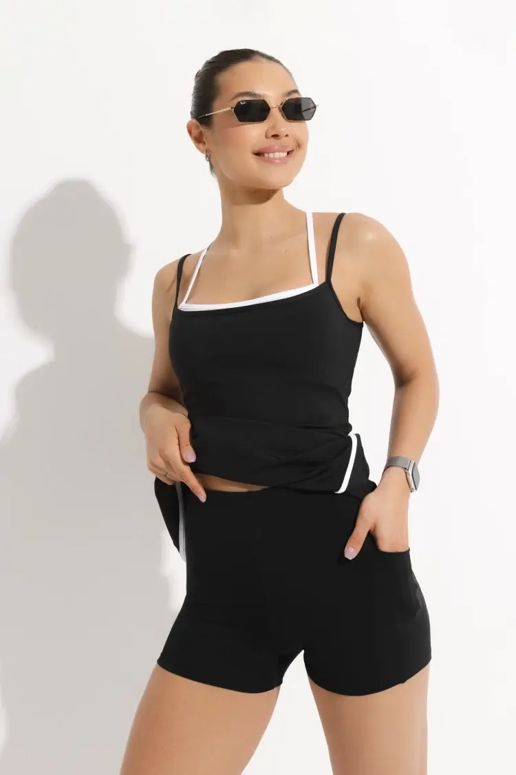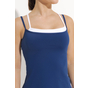 - Контрастные двойные бретели и окантовка делают образ свежим и стильным.
