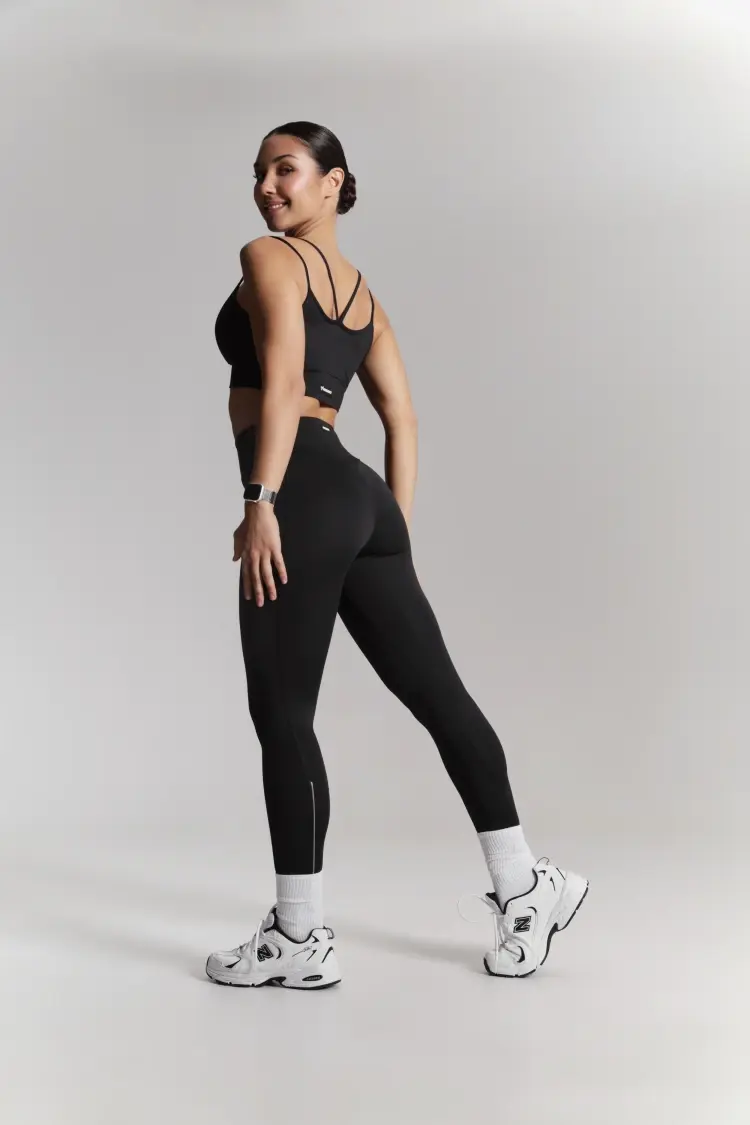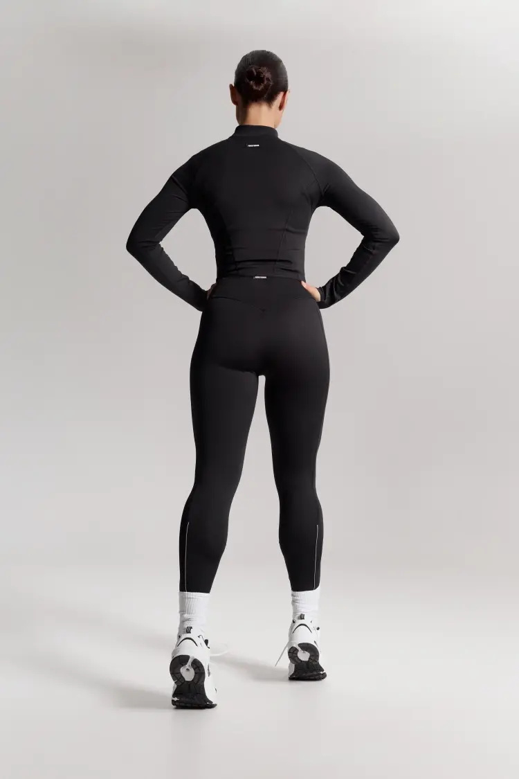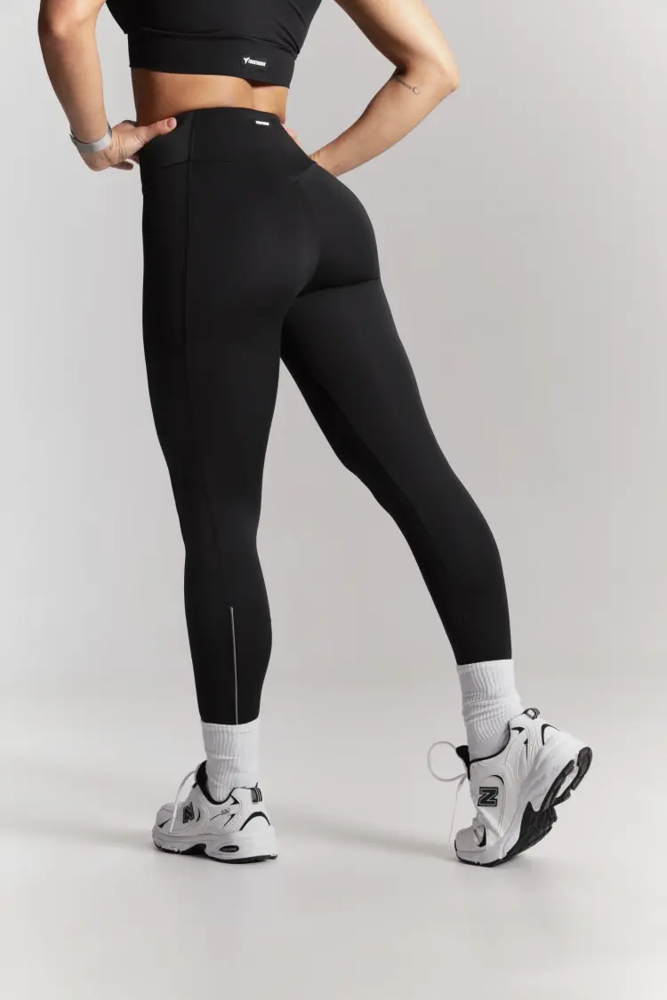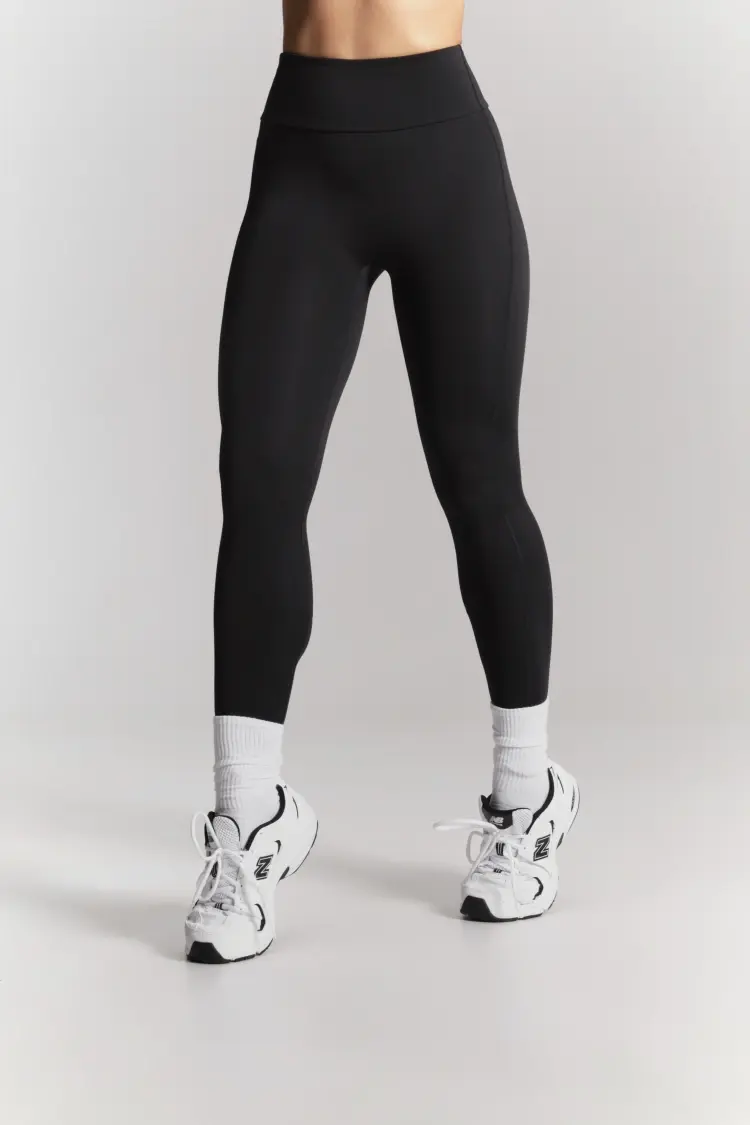 – Базовые чёрные лосины с высокой посадкой — комфортно фиксируются на талии, подчёркивая линию корпуса.
