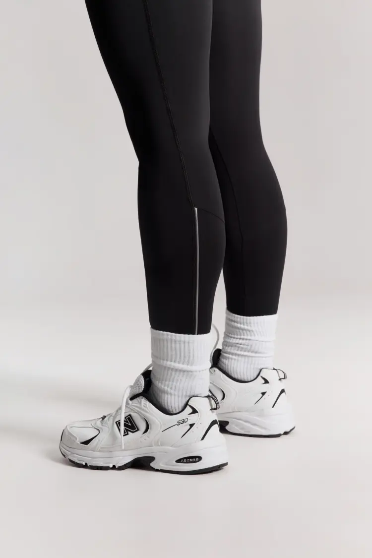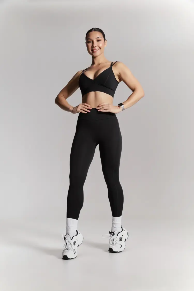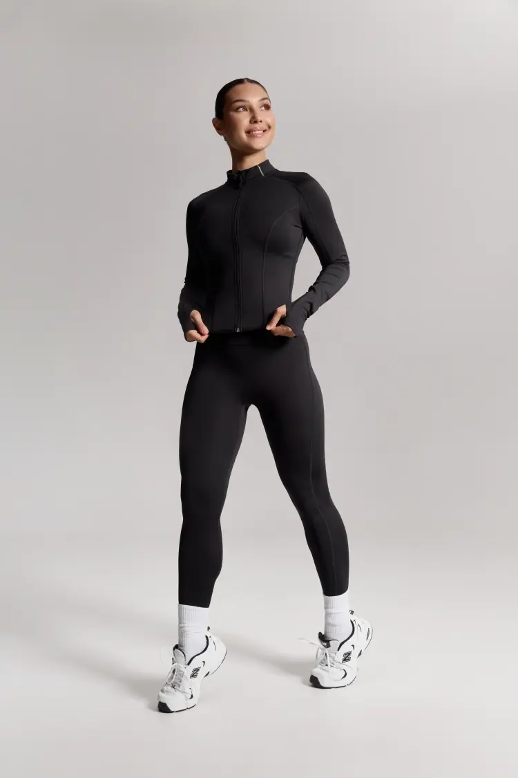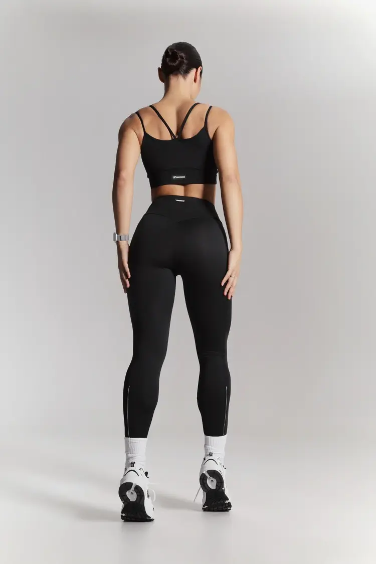 – Базовые чёрные лосины с высокой посадкой — комфортно фиксируются на талии, подчёркивая линию корпуса.