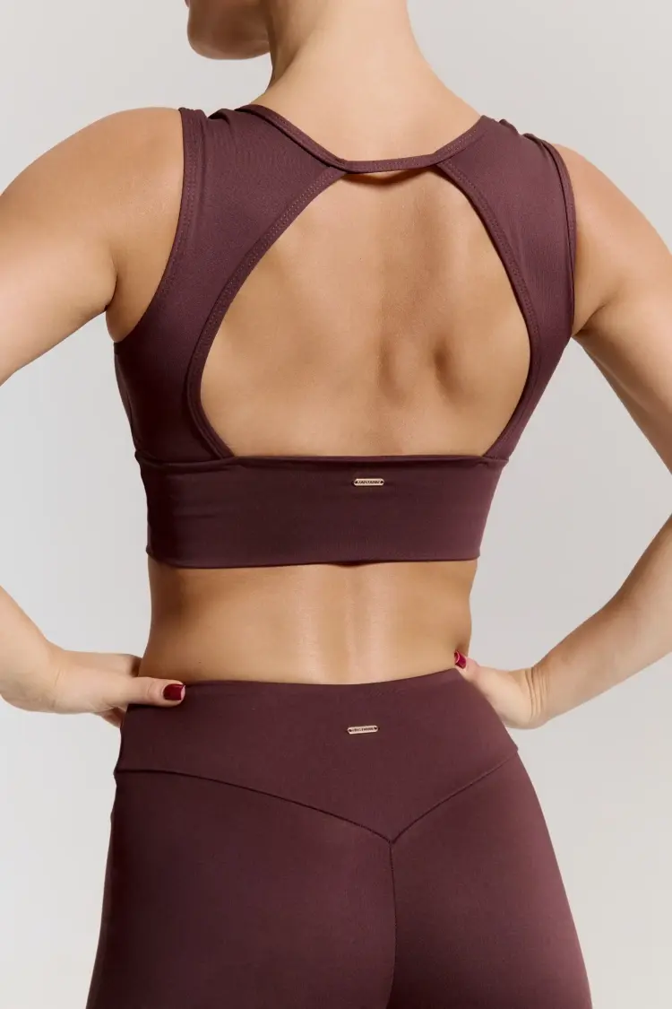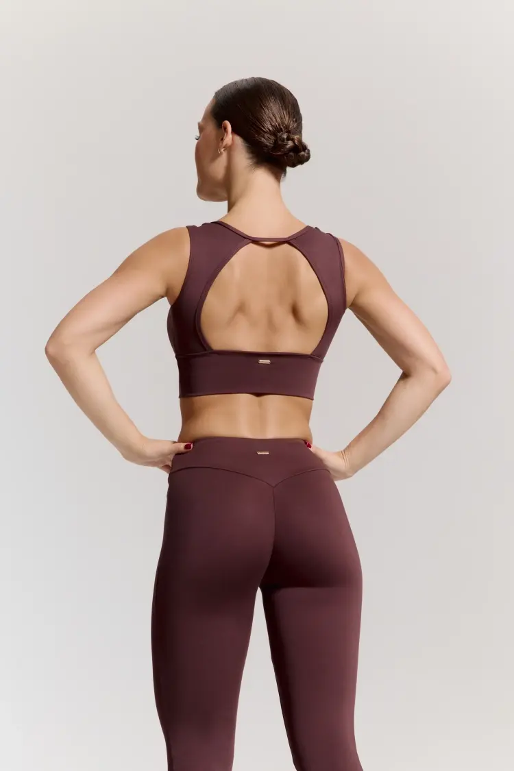 – Спортивный топ с эффектным вырезом на спине добавляет образу динамики и стиля.