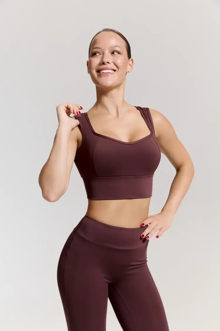 – Плотные широкие бретели фиксируют топ, равномерно распределяя нагрузку и не врезаясь в плечи.