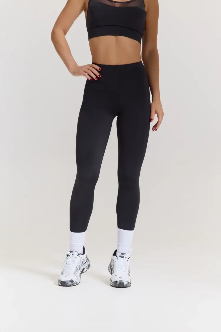- Базовые леггинсы с широким , высоким поясом в форме галочки спереди и сзади.